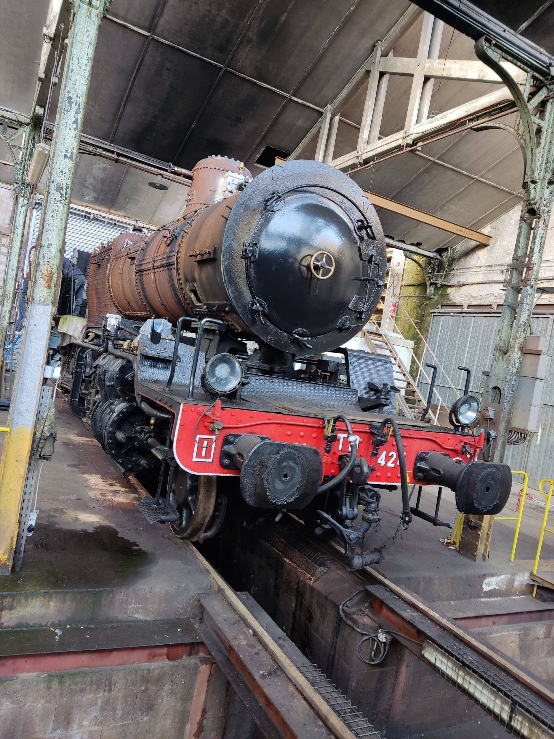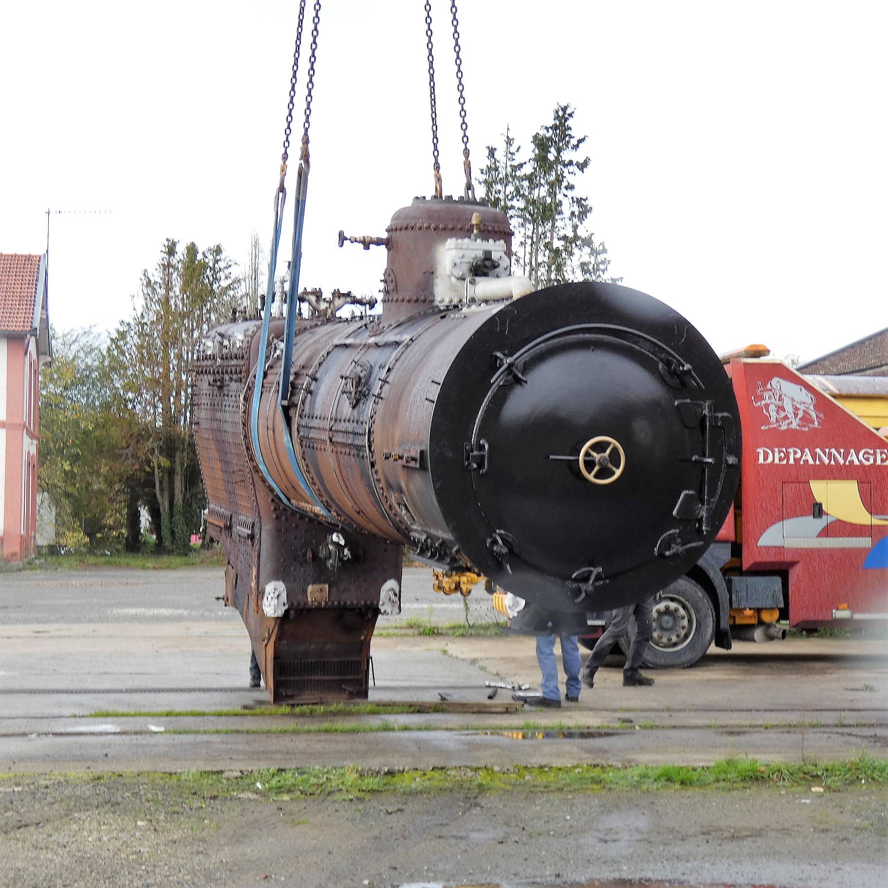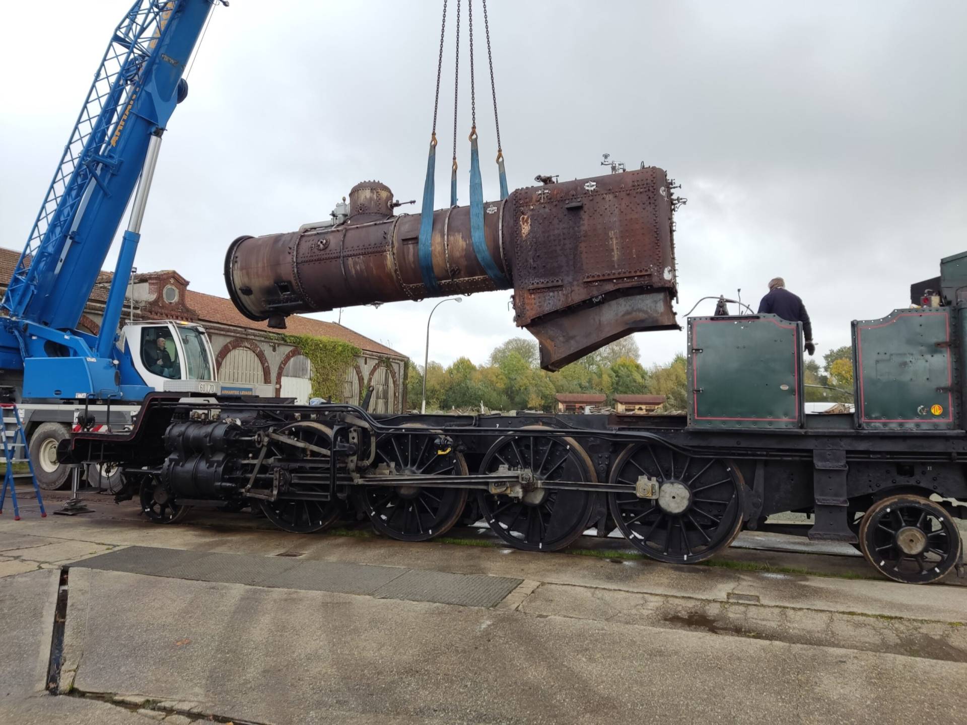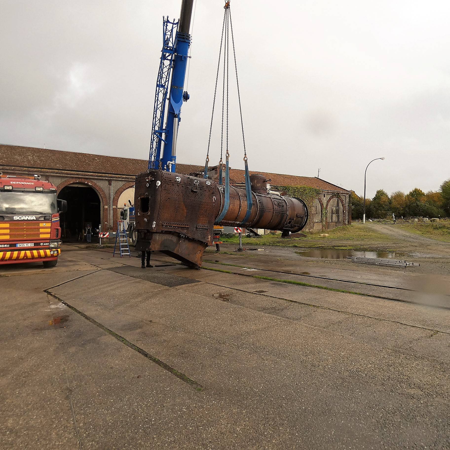 Tous les 10 ans, l’équipe d’entretien de la loco 141 TB 424 réalise le démontage et la levée de la chaudière afin d’en réaliser le contrôle et la maintenance avant une remise en route pour la prochaine saison de la Vapeur du Trieux (leur site). Ici, la chaudière sera remplie d’eau pour s’assurer qu’elle est bien étanche. Et pour ça, ils ont sorti les gros moyens le 12 novembre 2022.