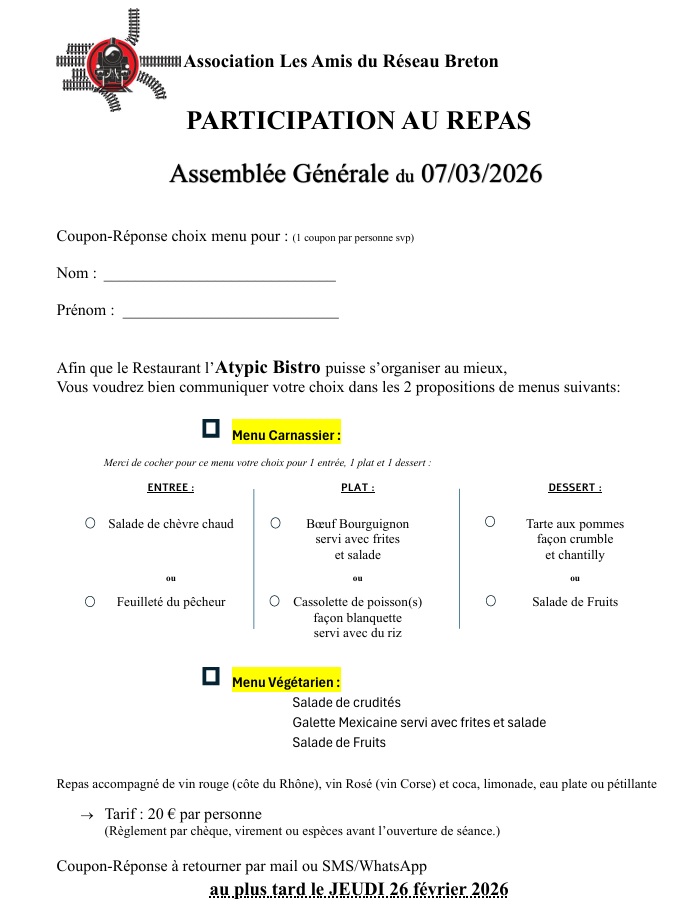 Afin de faciliter l’organisation, merci de bien vouloir communiquer votre choix de menu (ci-dessous) par mail ou par téléphone, au plus tard le jeudi 26 février 2026, auprès de :